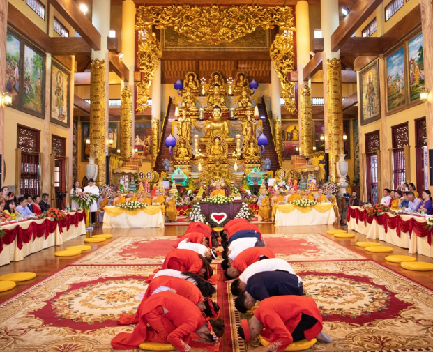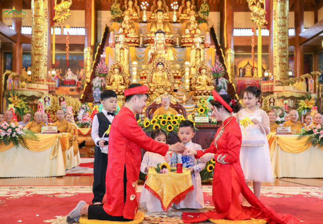 - Cô dâu, chú rể quỳ trước Tam Bảo, phát nguyện sống hòa thuận, chung thủy, cùng nhau tu học Phật pháp.