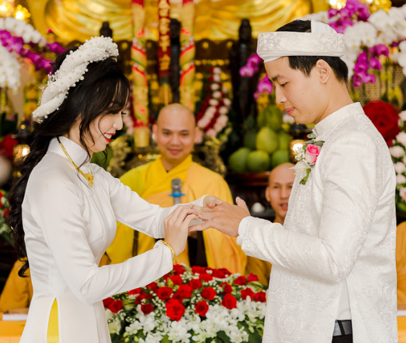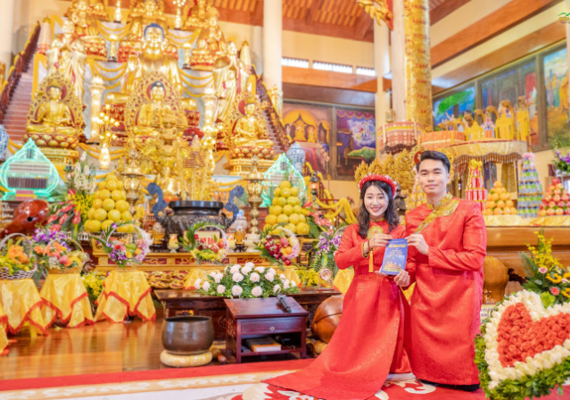 - Trang phục: cô dâu chú rể thường mặc áo dài truyền thống, một số chùa yêu cầu mặc áo tràng lam.
