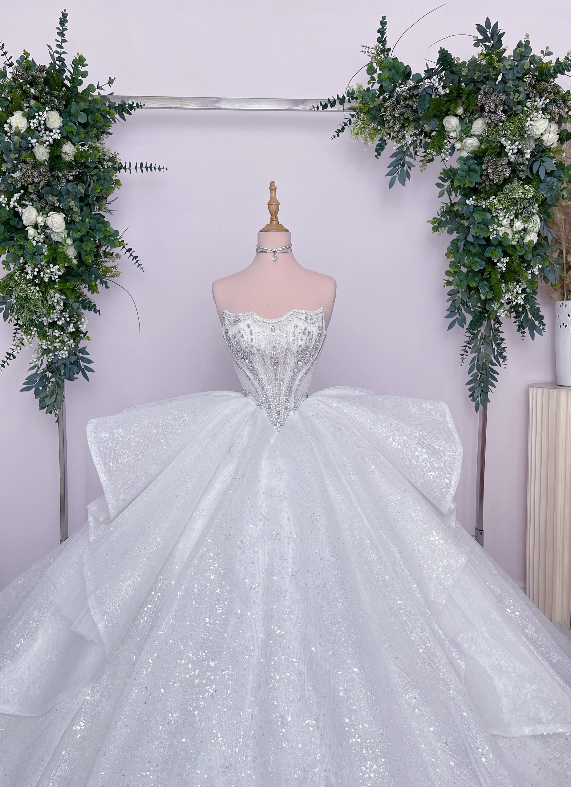 Váy cưới công chúa màu trắng có chân váy bồng bềnh, tùng váy rộng xòe biến nàng dâu thành cô công chúa trong truyện cổ tích.